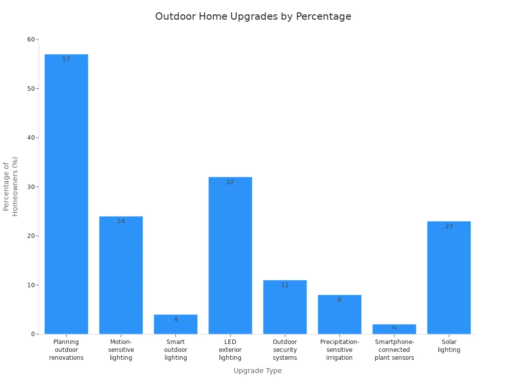 ஸ்மார்ட் தொழில்நுட்பம் வெளிப்புற விளக்குகளைப் பயன்படுத்துவதை எளிதாக்குகிறது. உங்கள் தொலைபேசி அல்லது குரல் மூலம் உங்கள் விளக்குகளைக் கட்டுப்படுத்தலாம். பல அமைப்புகள் விளக்குகளை இயக்க மற்றும் அணைக்க நேரத்தை அமைக்க உங்களை அனுமதிக்கின்றன. இது ஆற்றலைச் சேமிக்க உதவுகிறது மற்றும் உங்கள் வீட்டைப் பாதுகாப்பாக வைத்திருக்க உதவுகிறது. விளக்குகள் எவ்வளவு பிரகாசமாக அல்லது வண்ணமயமாக உள்ளன என்பதை நீங்கள் மாற்றலாம்.