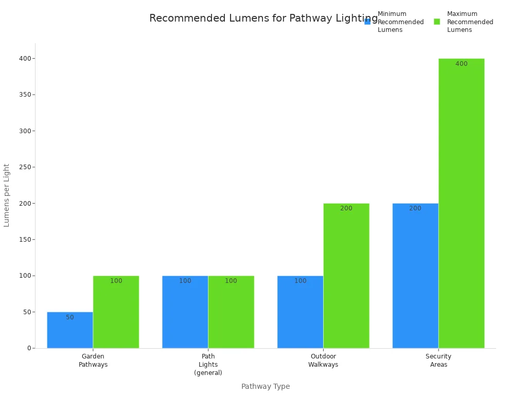 வெளியில் பாதுகாப்பான பாதைகள் இருப்பது முக்கியம். பாதை விளக்குகள் மக்கள் எங்கு நடக்க வேண்டும் என்பதைப் பார்க்க உதவுகிறது. இது பயணங்களை நிறுத்தி விழுகிறது. தோட்டப் பாதைகளுக்கு, 50-100 லுமன்கள் கொண்ட விளக்குகளைப் பயன்படுத்தவும். நல்ல வெளிச்சத்திற்கு நடைபாதைகளுக்கு 100-200 லுமன்கள் தேவை. நீங்கள் அதிக பாதுகாப்பை விரும்பினால், ஒரு ஒளிக்கு 200-400 லுமன்களைப் பயன்படுத்தவும். வெளிச்சத்திற்கு 6-8 அடி இடைவெளியில் வெளிப்புற விளக்குகளை வைக்கவும். குறுகிய பாதைகளுக்கு நெருக்கமாக விளக்குகள் தேவை. பரந்த பாதைகள் தொலைவில் விளக்குகளைக் கொண்டிருக்கலாம். தரையில் இருந்து 14 அங்குல உயரத்தில் விளக்குகளை வைக்கவும். இது ஒரு நேரடி ஒளிக்கற்றையை அளிக்கிறது மற்றும் பாதையை அழகாக்குகிறது.