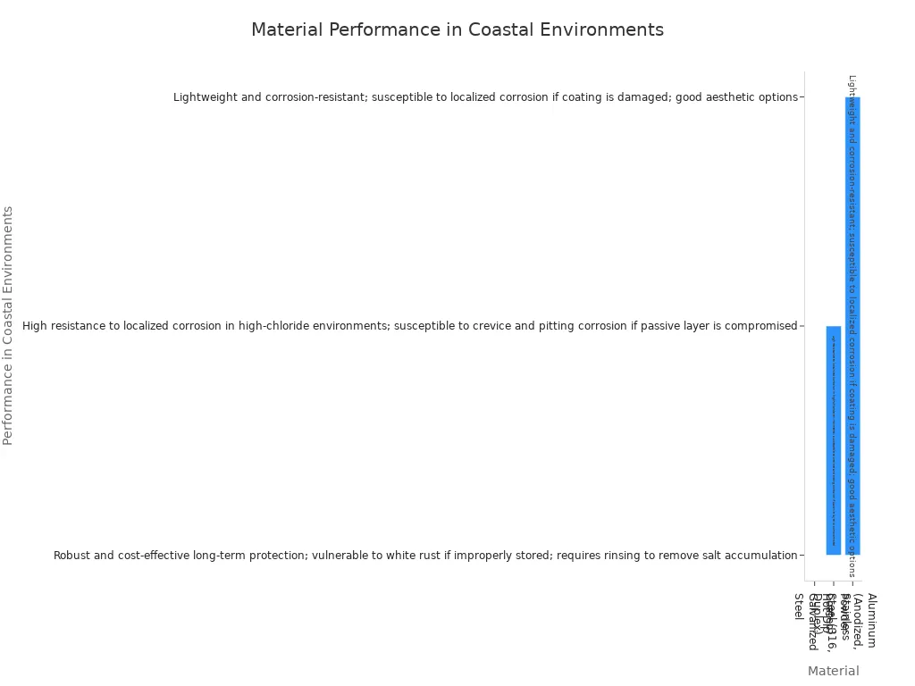 விளக்குகள் நீண்ட காலம் நீடிக்க, உற்பத்தியாளர்கள் பவுடர் கோட் பூச்சுகள் மற்றும் சீல் செய்யப்பட்ட அட்டைகளைப் பயன்படுத்துகின்றனர். இந்த அம்சங்கள் புயல்கள், ஈரமான காற்று மற்றும் உப்பு தெளிப்பு ஆகியவற்றிலிருந்து தப்பிக்கும் வானிலை எதிர்ப்பு விளக்குகளுக்கு உதவுகின்றன. கடலுக்கு அருகில் பல்வேறு பொருட்கள் எவ்வாறு செயல்படுகின்றன என்பதை கீழே உள்ள விளக்கப்படத்தில் காணலாம்:
